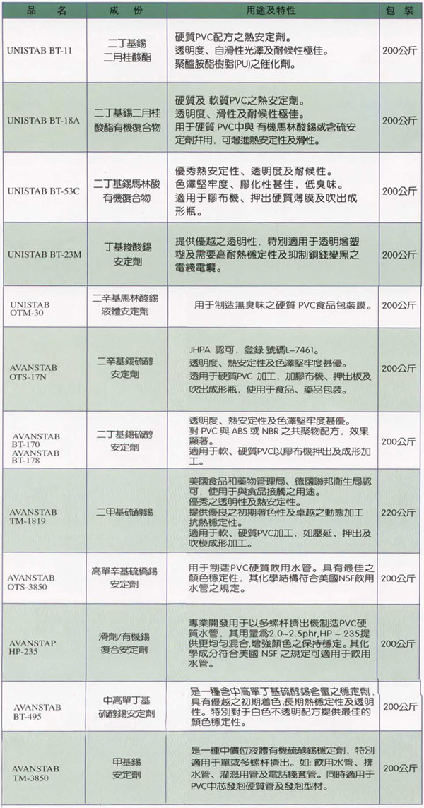 聯合化學提供適用于PVC工業需求的廣泛產品組合。多樣化的產品組合包括全系列的穩定劑 、有機錫穩定劑、增塑劑、滑劑、發泡促進劑、加工助劑及可解決許多加工問題的多樣化添加劑。改善產品品質、加工工藝、提升客戶產品優良率及效率是公司對客戶的承諾。客戶在生產配方及加工工藝上更由聯合化學良好訓練及具有豐富經驗的服務團隊來支持。